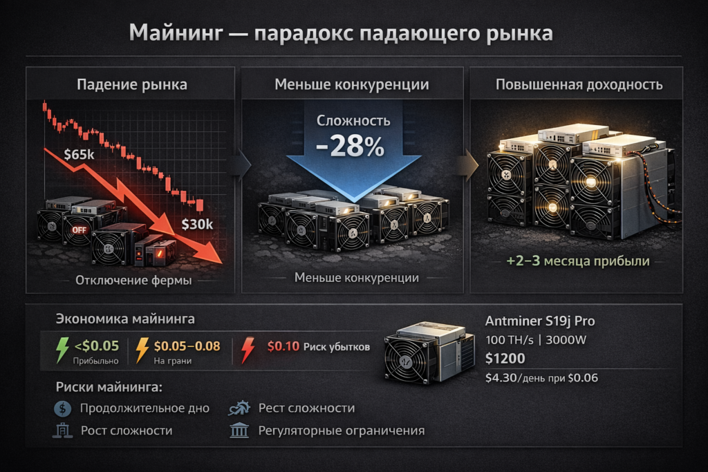 Когда цена падает, многие майнеры отключают оборудование. Сложность сети снижается → оставшиеся получают больше монет за тот же хешрейт.